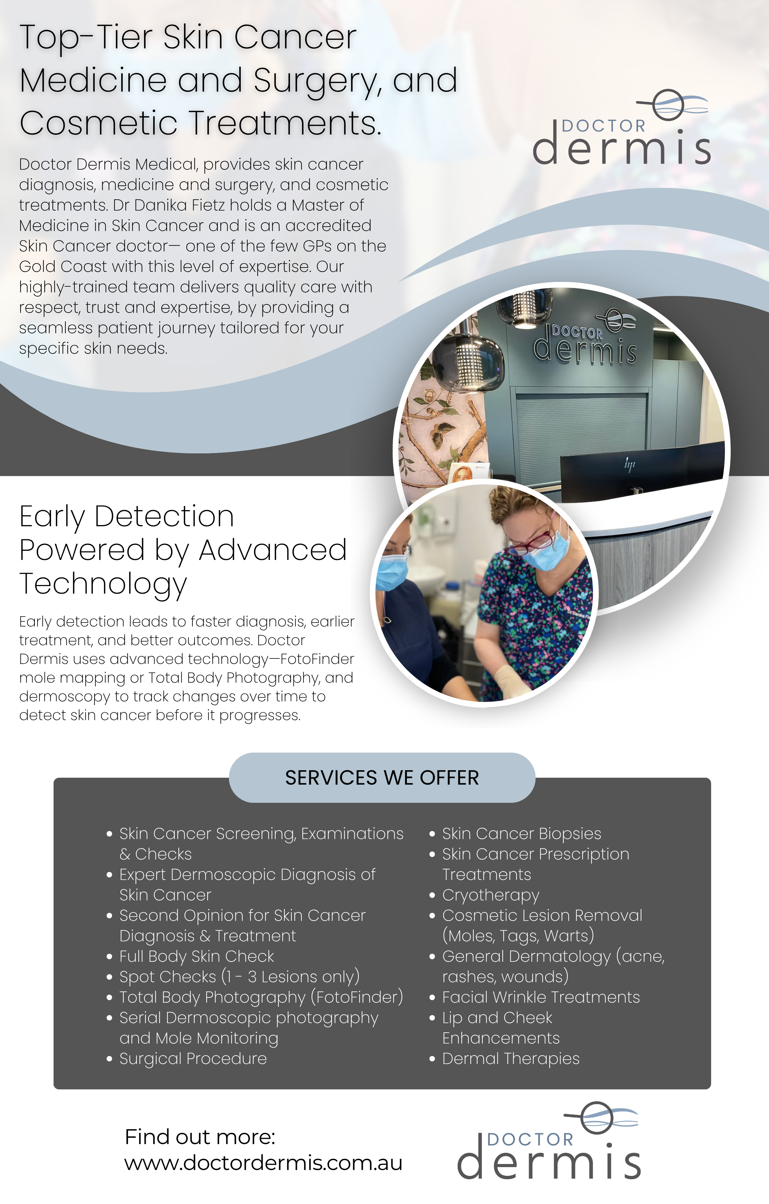 Doctor Dermis is a leading clinic specialising in skin cancer medicine and surgery, and cosmetic treatments, located in Robina on the Gold Coast. The clinic has a special interest in the diagnosis, medical and surgical treatments of skin cancer, as well as advanced cosmetic and dermal therapies.
